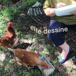 Le cube montre un détail de la couverture du livre d’artiste, deux œuvres de l’exposition, chacune amalgamée à un extrait de sa poésie, et deux photos prises par son conjoint sculpteur, Lucien Chabot : Ginette qui sculpte, Ginette qui écrit. Elle dessine aussi : sous une autre photo qu’elle m’a expédiée, elle a mis cette légende : «Sous mon arbre préféré avec mes poules apprivoisées, croquis pour nouvelle exposition.» Je ne résiste pas à vous la montrer.