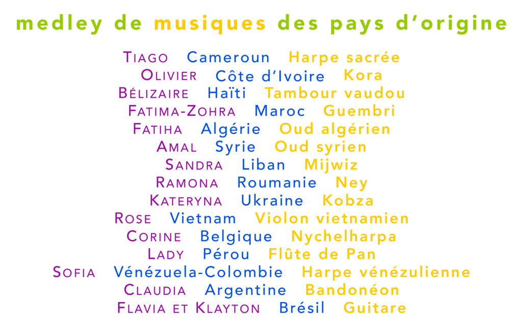 Musique : Mattias MECHALY a monté ce medley de 16 musiques instrumentales représentatives des traditions des pays des seize participant.e.s au projet «ICI, LÀ-BAS».